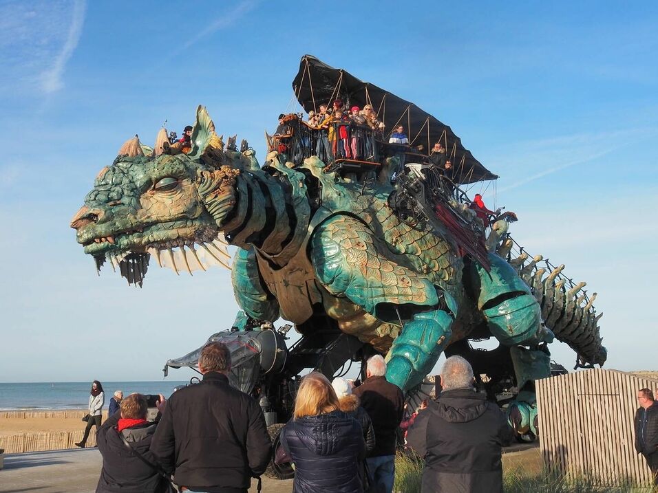 Inga war am Wochenende sogar mit ihrer Familie in Calais, wo sie mit der Attraktion des Ortes Bekanntschaft schloss: einem Feuer und Wasser spuckenden Drachen! Es ist eine große Maschine, auf der man mitfahren kann.