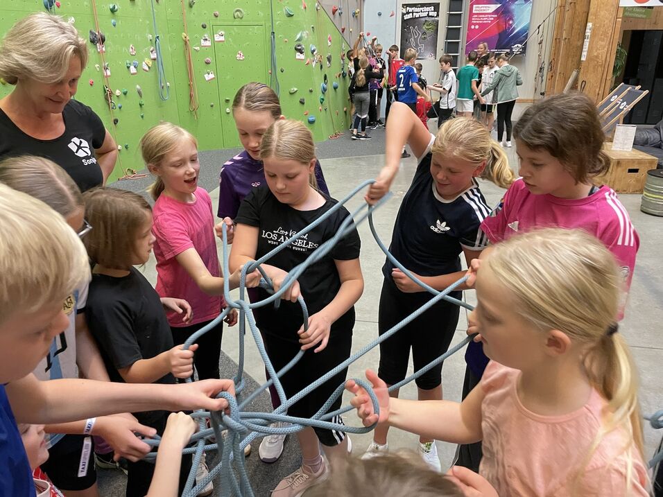 Am 12. November unternahm die Klasse 6b einen Ausflug in die Kletterhalle in Schmallenberg, um das Gemeinschaftsgefühl und gegenseitiges Vertrauen zu stärken. Der Tag startete mit spannenden Kooperationsspielen, die von zwei Mitarbeiterinnen der Freizeitwelt geleitet wurden. Dabei mussten die Schülerinnen und Schüler in zwei großen Gruppen kreative Lösungen finden, um die gestellten Aufgaben gemeinsam erfolgreich zu meistern. Diese Aktivitäten sorgten für viel Freude und Motivation.