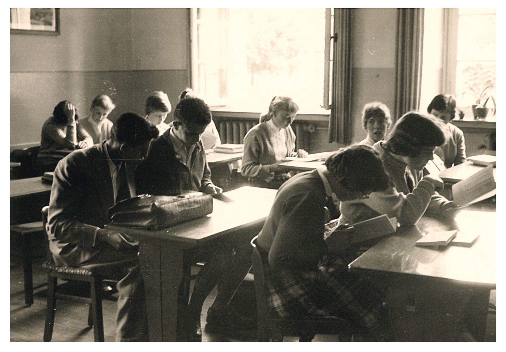 Frau Gertrud Nabbefeld (geb. Arens) aus dem Abiturjahrgang 1961 ist dankenswerterweise unserem Aufruf gefolgt und hat uns ein Dutzend alter Fotos zukommen lassen. Diese dokumentieren sowohl Ausschnitte aus ihrer Schulzeit als auch spätere Treffen des Abiturjahrgangs. Das heutige Bild zeigt eine Unterrichtssituation aus dem Jahr 1957, damals noch im Gebäude in der Wormbacher Straße. Seinerzeit firmierte unsere Schule unter der Bezeichnung Staatliche Aufbauschule. Dieses Bezeichnung trug sie nur von 1954 bis 1956.