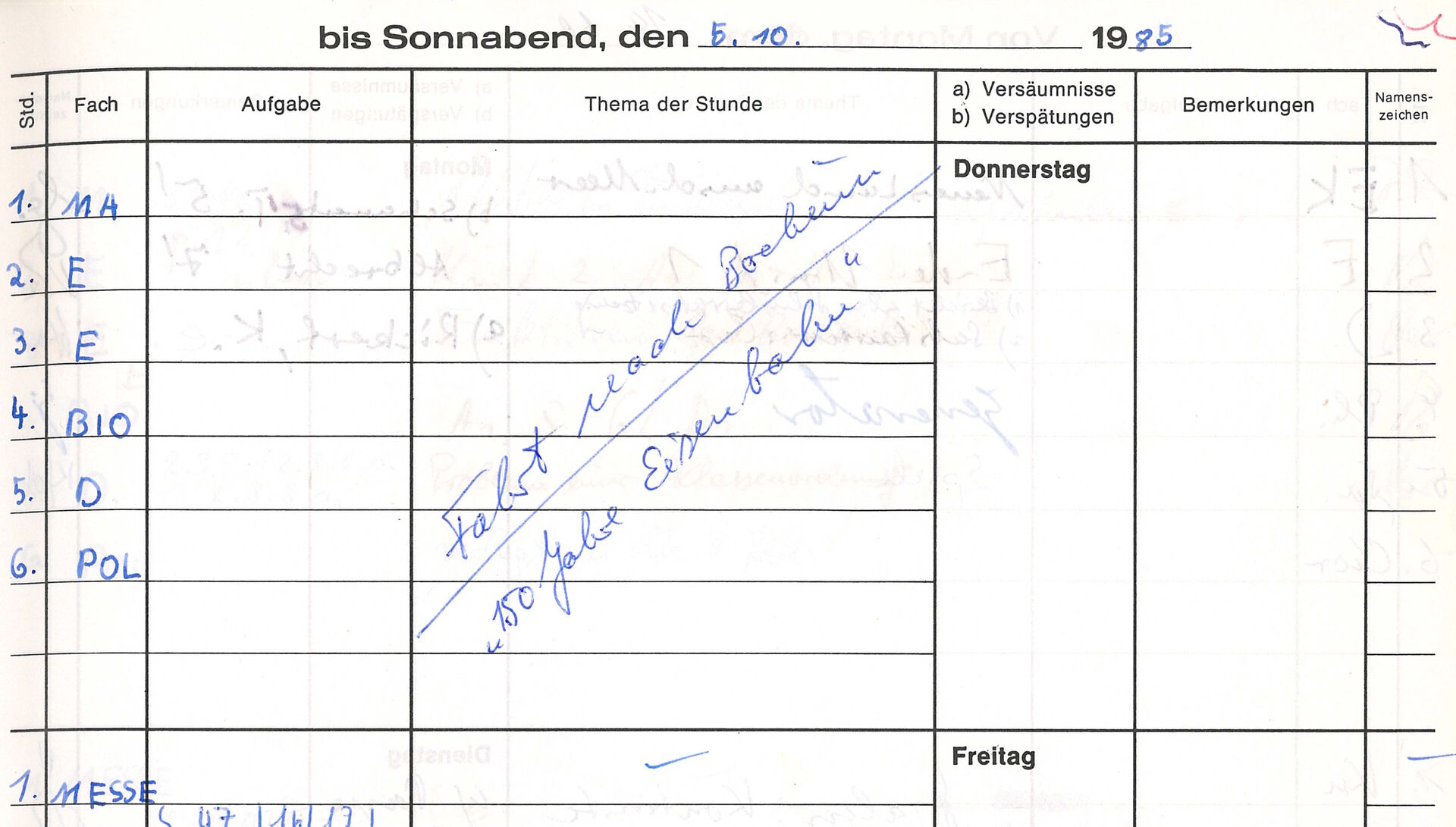 Vor ziemlich genau 40 Jahren, am 03. Oktober 1985, machte das Städtische Gymnasium zu seinem 60 jährigen Jubiläumm einen ganz besonderen Ausflug: In einem eigens gecharterten Sonderzug fuhr die gesamte Schulgemeinschaft vom damals noch existierenden Schmallenberger Bahnhof ins Eisenbahnmuseum Bochum-Dahlhausen. Dort fand anlässlich des 150. Geburtstages der Eisenbahn in Deutschland eine große Fahrzeugschau mit fast 100 Lokomotiven und ebenso vielen Waggons statt.