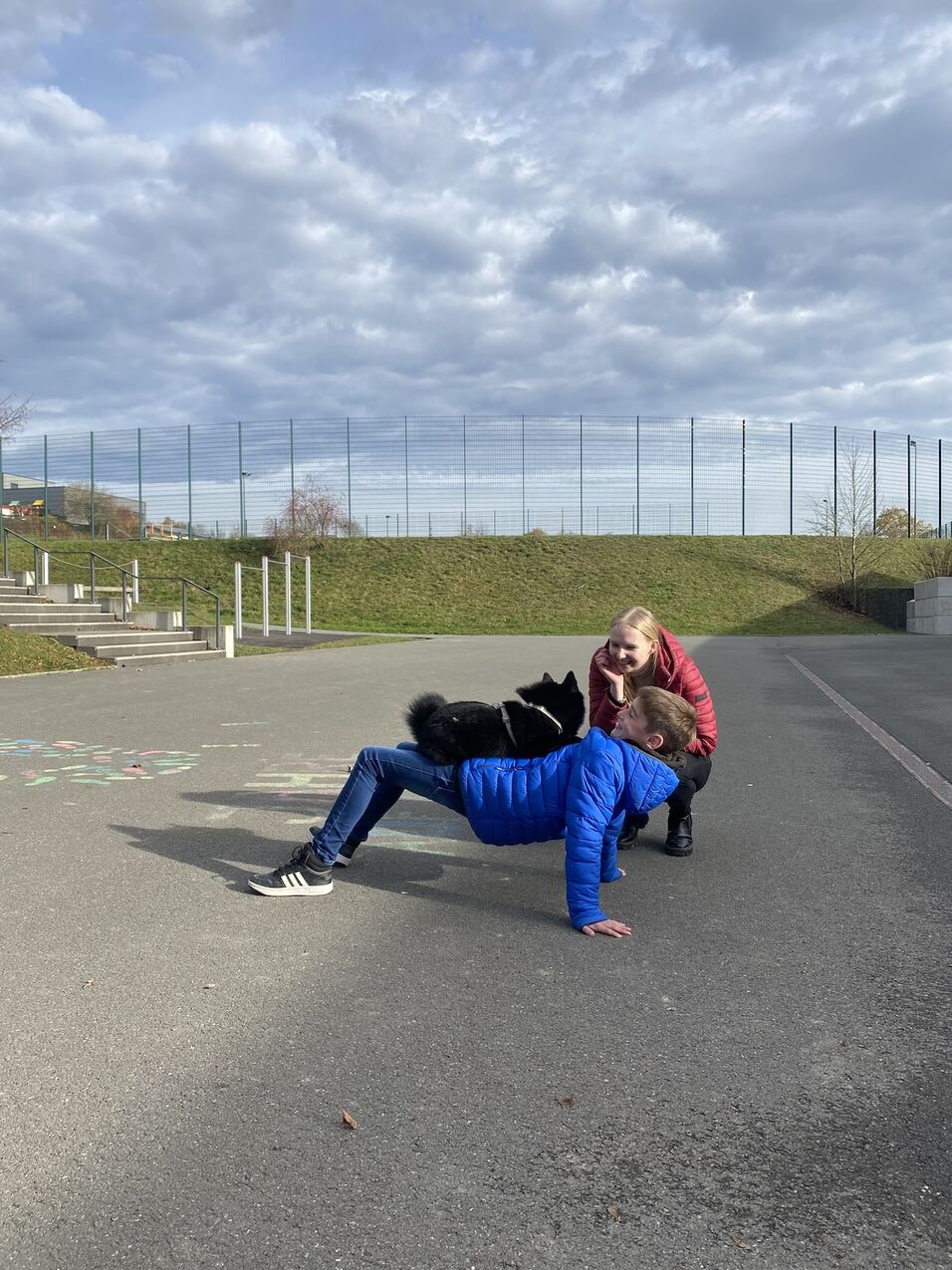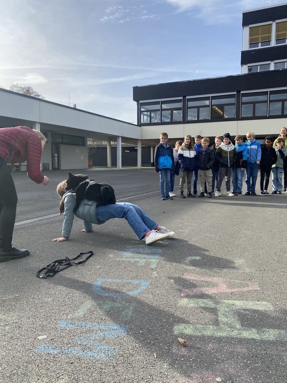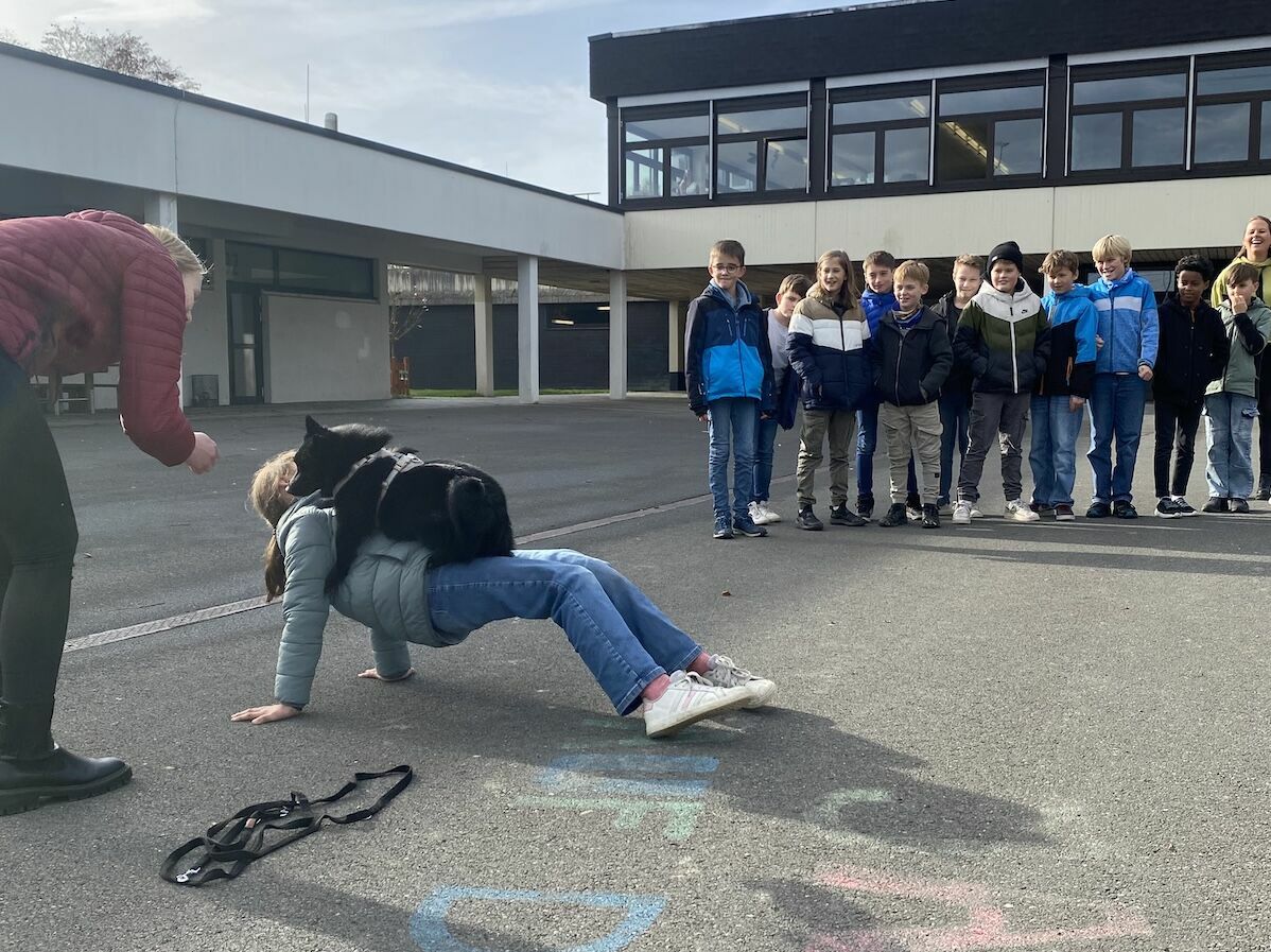 Auf dem Schulhof zeigte Sammy einige Kunststücke, bei denen die Klasse aktiv einbezogen wurde. Dabei hatten alle nicht nur viel Spaß, sondern lernten auch eine Menge über das Zusammenleben von Mensch und Hund.