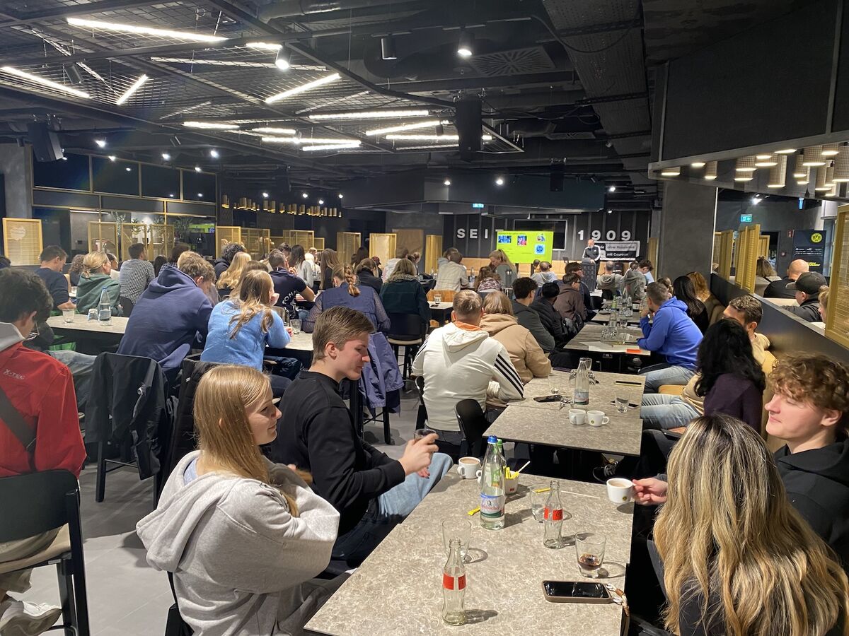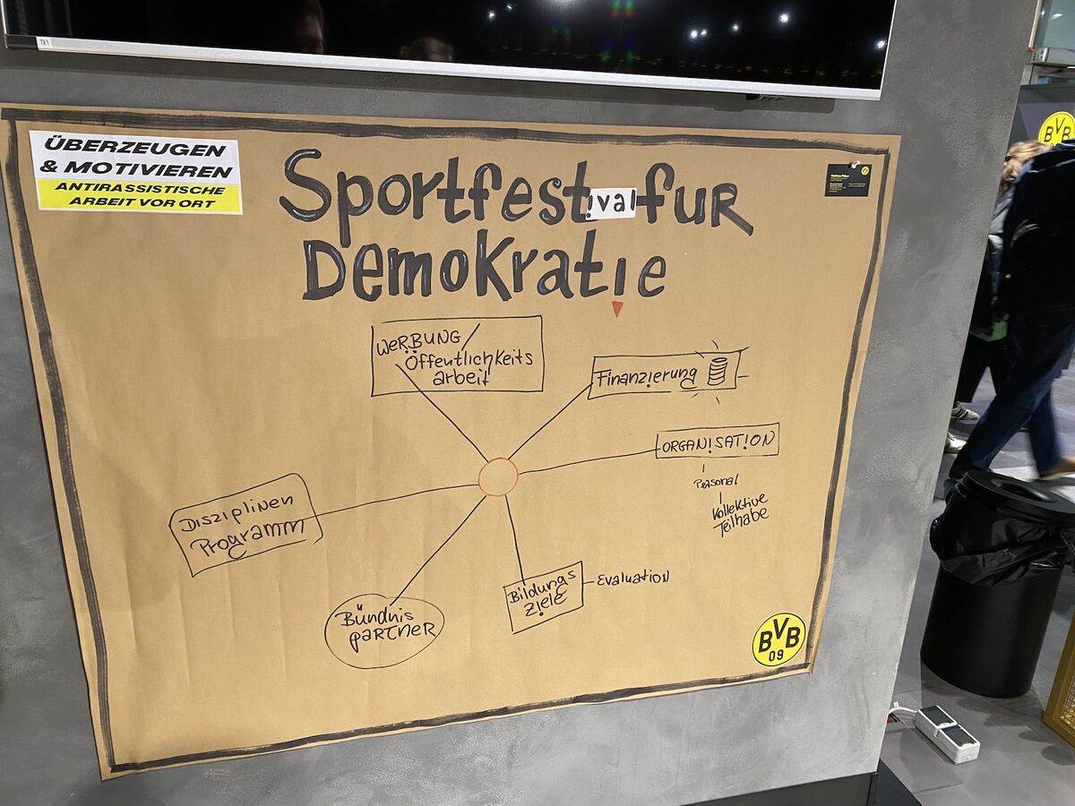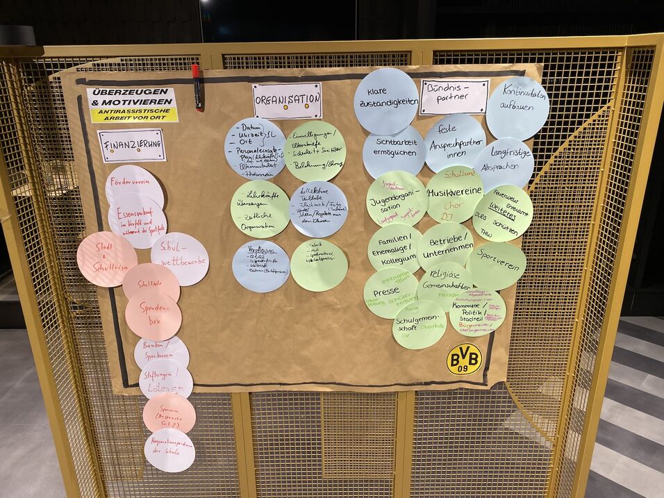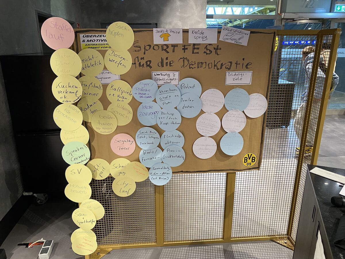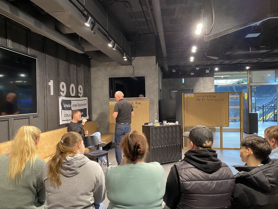 Im Anschluss nahmen unsere Vertreterinnen und Vertreter am Workshop „Nachhaltige Courage-Arbeit an der Schule“ teil. Unter der Leitung von Matthias Röben, pädagogischer Leiter des Nachwuchsleistungszentrums von Borussia Dortmund, wurden Strategien zur Gewinnung von Schülerinnen und Schülern für demokratische Projekte vorgestellt. Gemeinsam mit Teilnehmenden anderer Schulen entwickelte die Gruppe Ideen für ein sportliches Begegnungsfest, das zukünftig auch an unserer Schule umgesetzt werden kann.